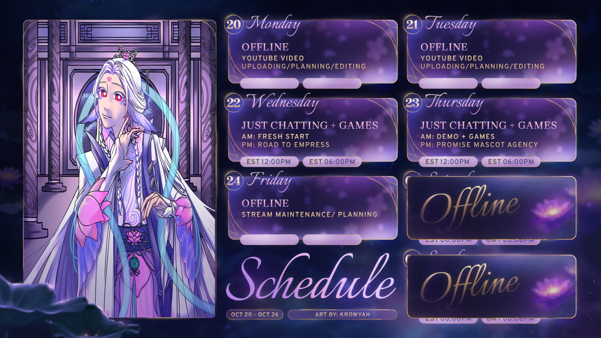 Weekly schedule: Each week, this section will be updated to reflect the weekly schedule I have chosen for the week. If I am not online despite being marked as work, please look at our Discord/Twitter/Bluesky for any updates about it.